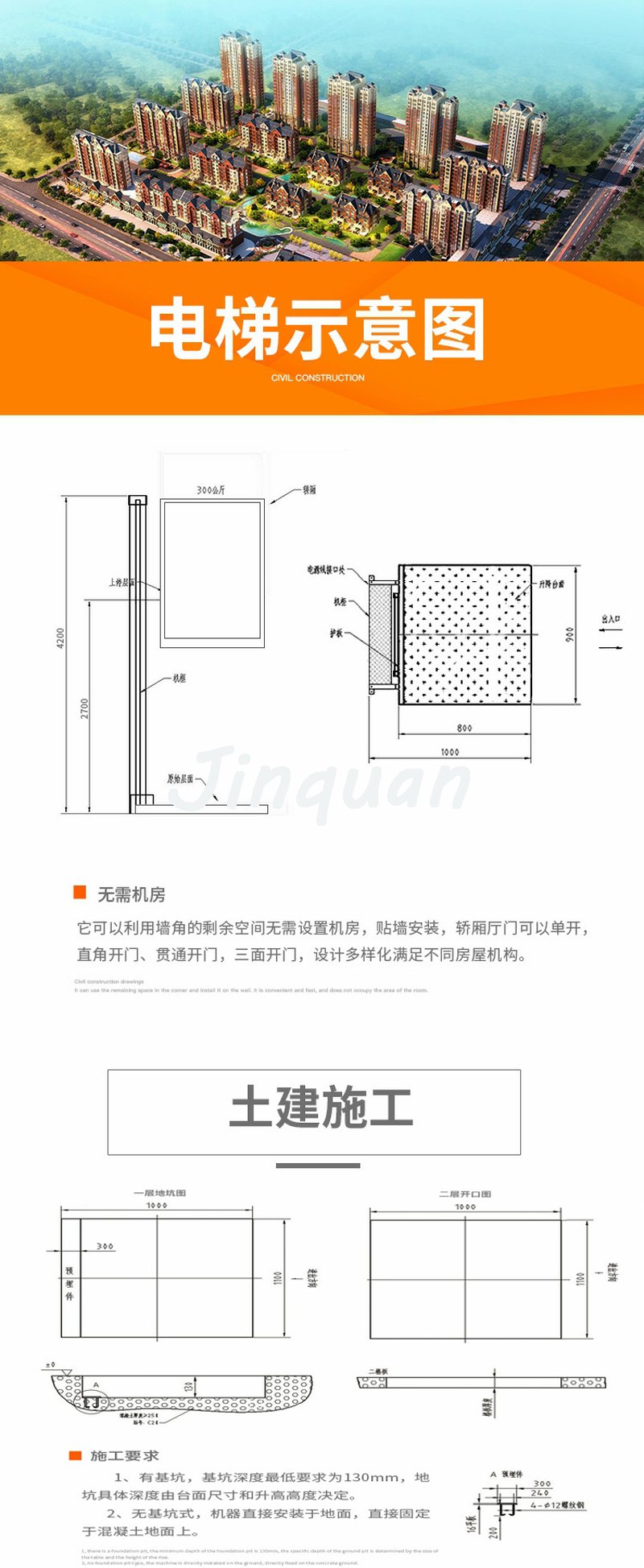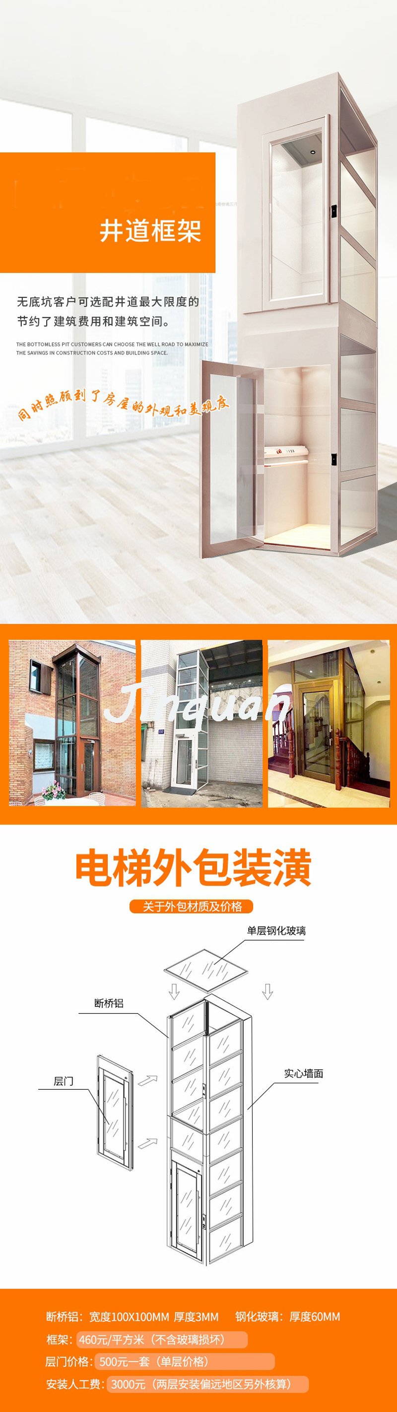 家用電梯安裝時不需要機房和基坑,最小安裝占地面積僅需一平方米左右?;究钍椒譃槠脚_式,轎箱式和井道式。家用電梯可安裝在專用電梯井道內,或安裝在環繞樓梯的中間,也可以安裝在中空的大廳或房間;如沒有中空的大廳或房間,也可以在樓板上開出合適的孔;當然,室內如實在沒有合適空間,也可以加上井道安裝在室外。
