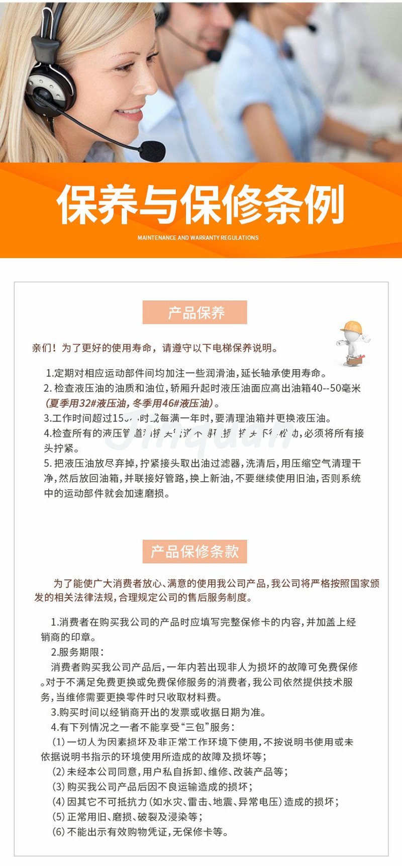 家用電梯,提供十二個月的質保期。在質保期內,如電梯出現故障,我們的專業維保人員會在二十四小時內趕到現場,免費進行維修保養。質保期外或質保期內屬人為操作不當導致的故障,我們也將在二十四小時內趕到現場,我們僅僅收取一點適當的成本費。